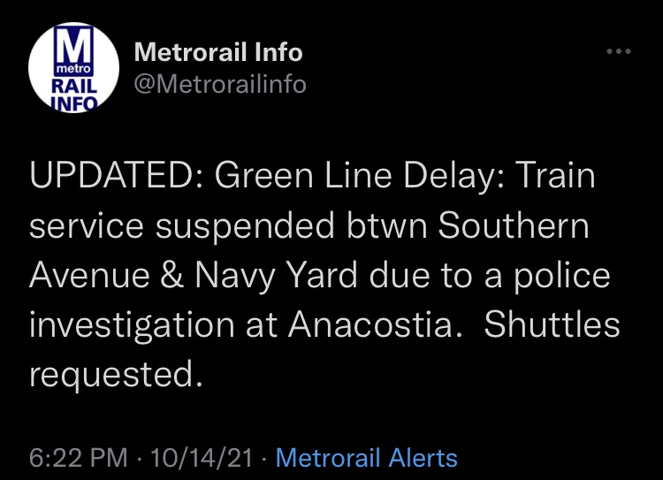 🟢 Single Tracking Navy Yard & Anacostia due to MTPD investigation Posted byRail Transit OPSOctober 14, 2021October 14, 2021Posted inMain At 6:01PM 🟢 510/Greenbelt reported an apparent stabbing aboard car 7487 at Anacostia Share this:Tweet Click to email a link to a friend (Opens in new window) Email Click to share on Reddit (Opens in new window) Reddit
