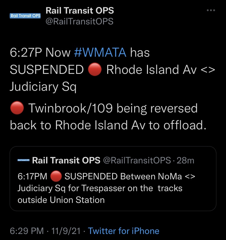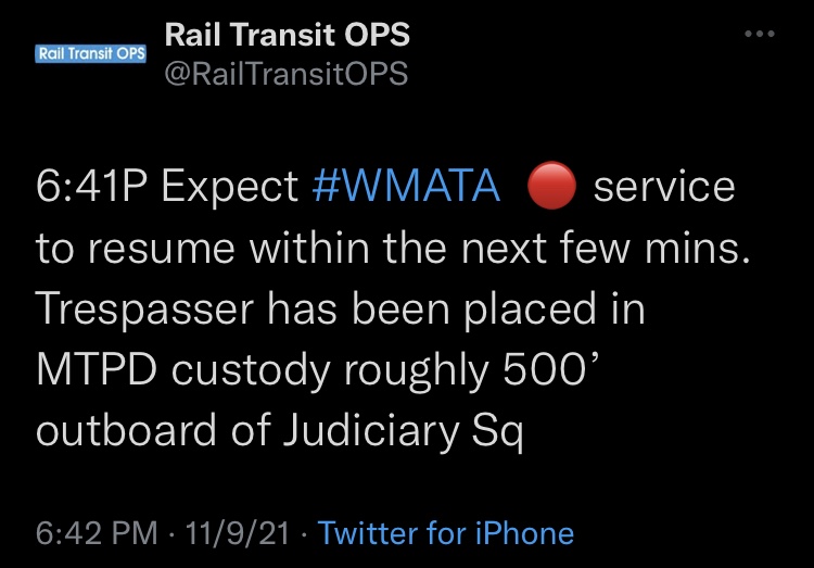 Trespasser 🔴 Judiciary Sq > Union Station Posted byRail Transit OPSNovember 9, 2021Posted inMain Share this:Tweet Click to email a link to a friend (Opens in new window) Email Click to share on Reddit (Opens in new window) Reddit